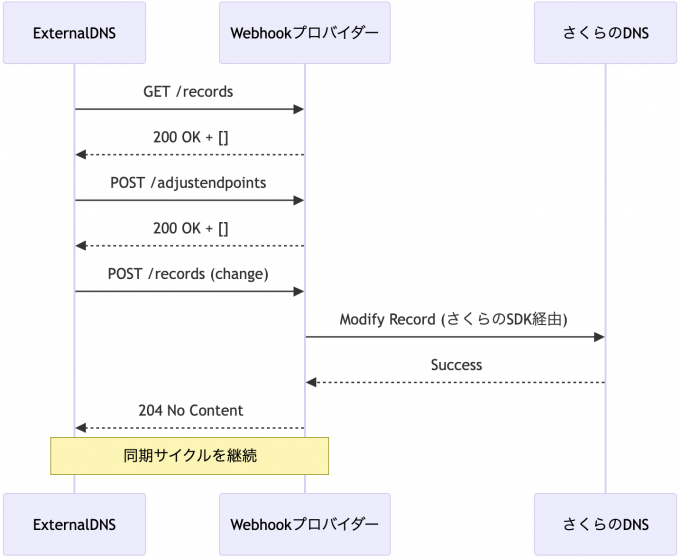 実際の内部の動きは下記のとおりです。ExternalDNSがKubernetesリソースの変化を検知し、Webhookプロバイダーを介してさくらのDNSに差分適用します。