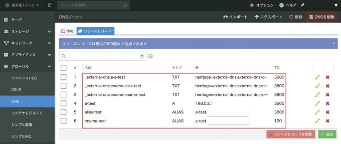 正常に適用された場合は、さくらのクラウドDNSのゾーン管理画面にA/CNAME/ALIASレコードと各レコードが ExternalDNSに管理されることを明示するTXTレコードが自動で追加されます。