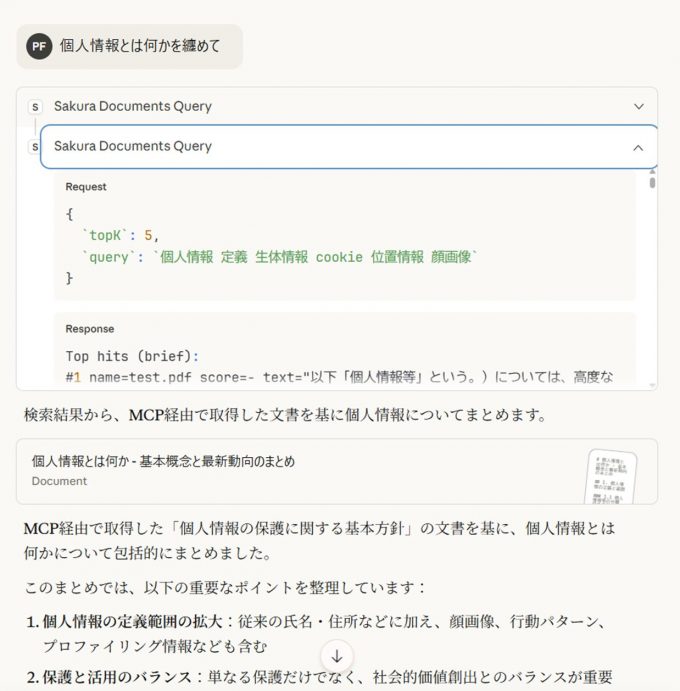 起動が完了したら対話を行うLLMが自身の判断でMCPを呼び出しその検索結果(RAG検索と異なり512トークン単位で分割された文章のかけら)がLLMにより自然な言葉に整形されレスポンスが戻ってきます。