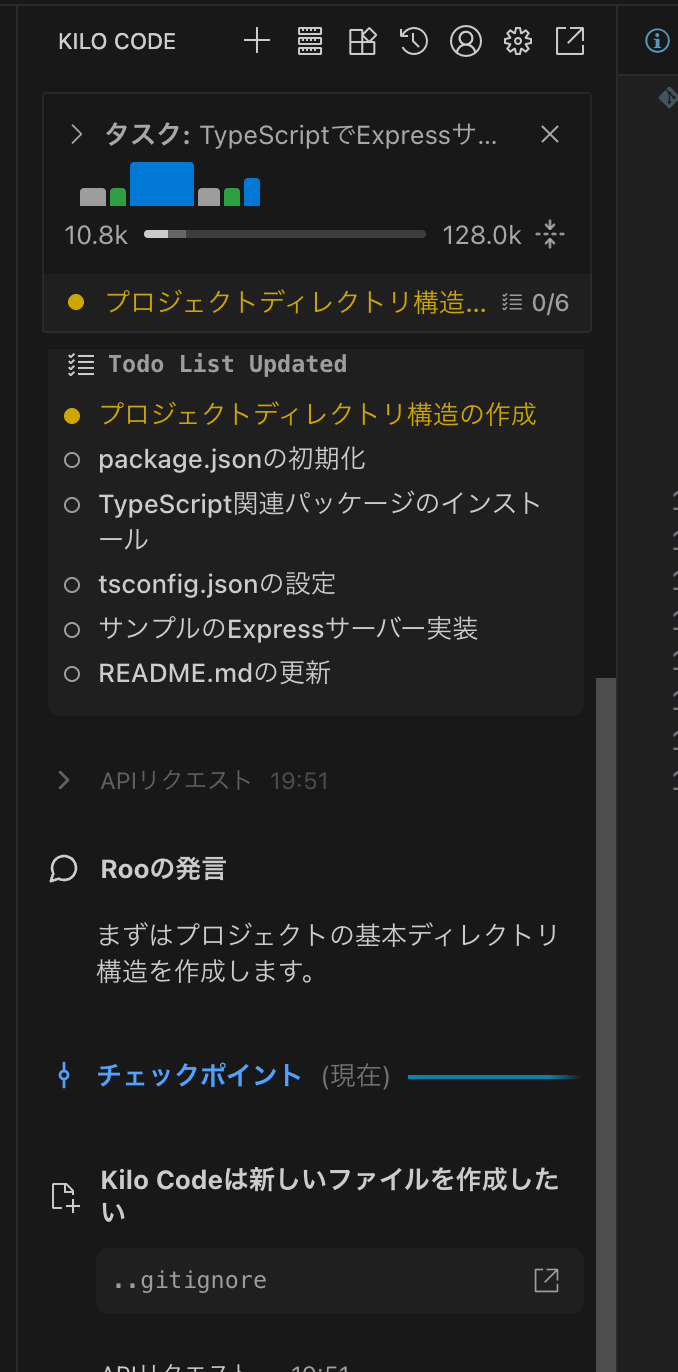 KiloCodeは、現在開いているファイルやプロジェクト構造を理解した上で応答します。