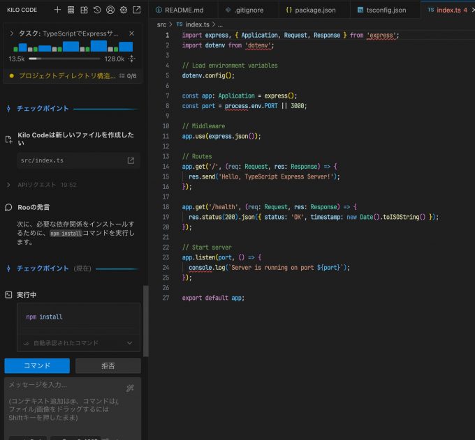 例えば、「TypeScriptでExpressサーバの基本的な構成を作成してください」とリクエストしてみます。