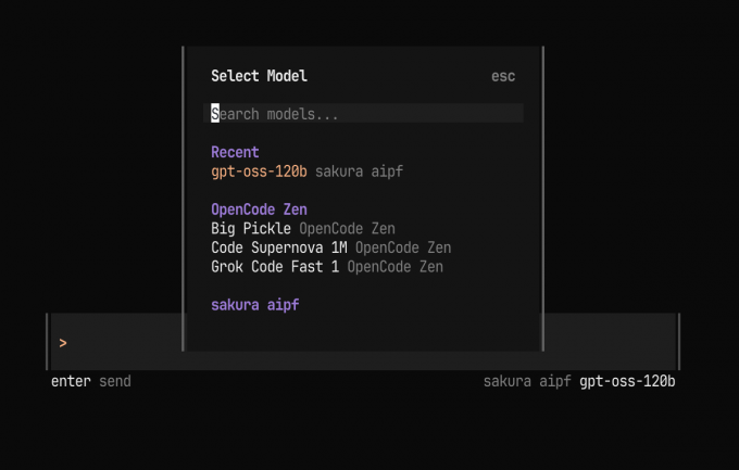 OpenCodeを起動後、/modelsコマンドを実行すると、利用可能なモデル一覧が表示されます。設定ファイルで定義したさくらのAI Engineのモデルも、この一覧に表示されます。モデルを選択することで、そのモデルを使用してAIアシスタントと対話できます。