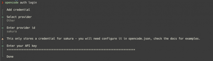 このコマンドを実行すると、APIキーの入力を求められます。provider を other にして 、provider id に sakura を指定します。