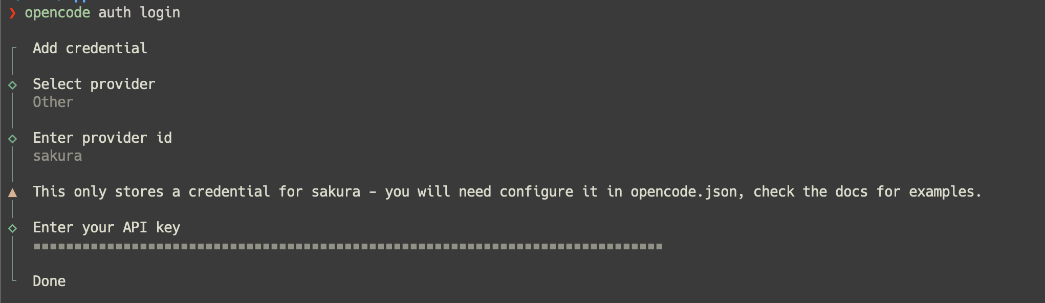 このコマンドを実行すると、APIキーの入力を求められます。provider を other にして 、provider id に sakura を指定します。