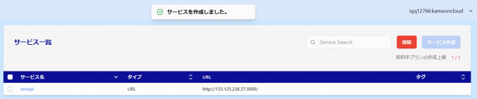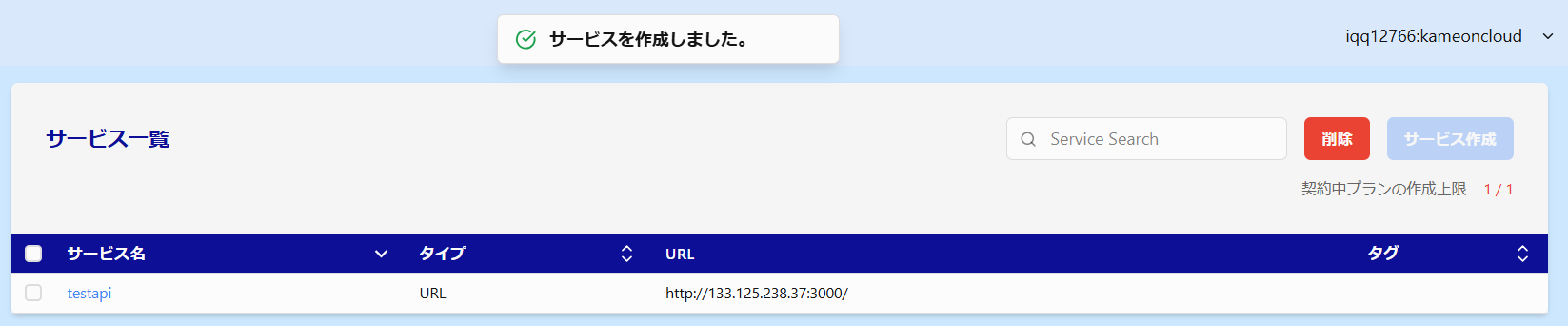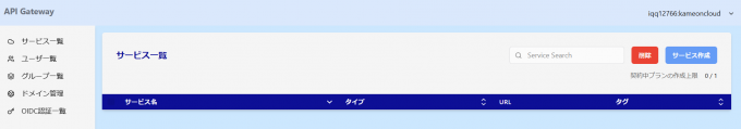 まず最初に行うことはサービスの作成です。サービスとはAPIのゲートウェイをホスティングする基盤のようなものとなりAPIごとに存在するものです。 サービス作成 をクリックします。