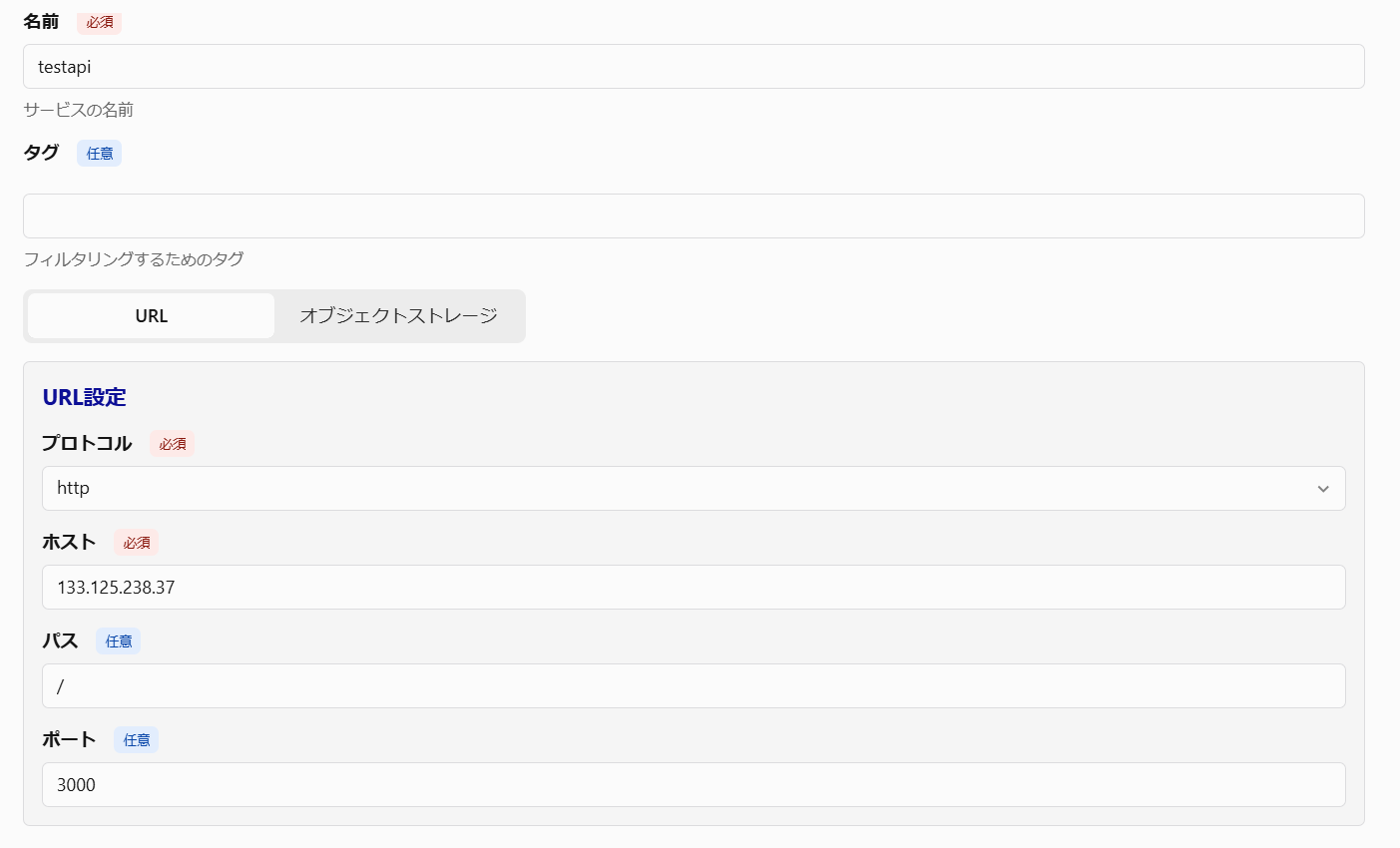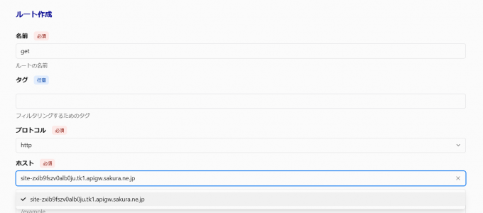 適当な名前を付けプロトコルにHTTPを指定します。その後ホストをドロップダウンメニューから指定します。ホストは上記手順のサービス設定時に自動で一つ作成されています。