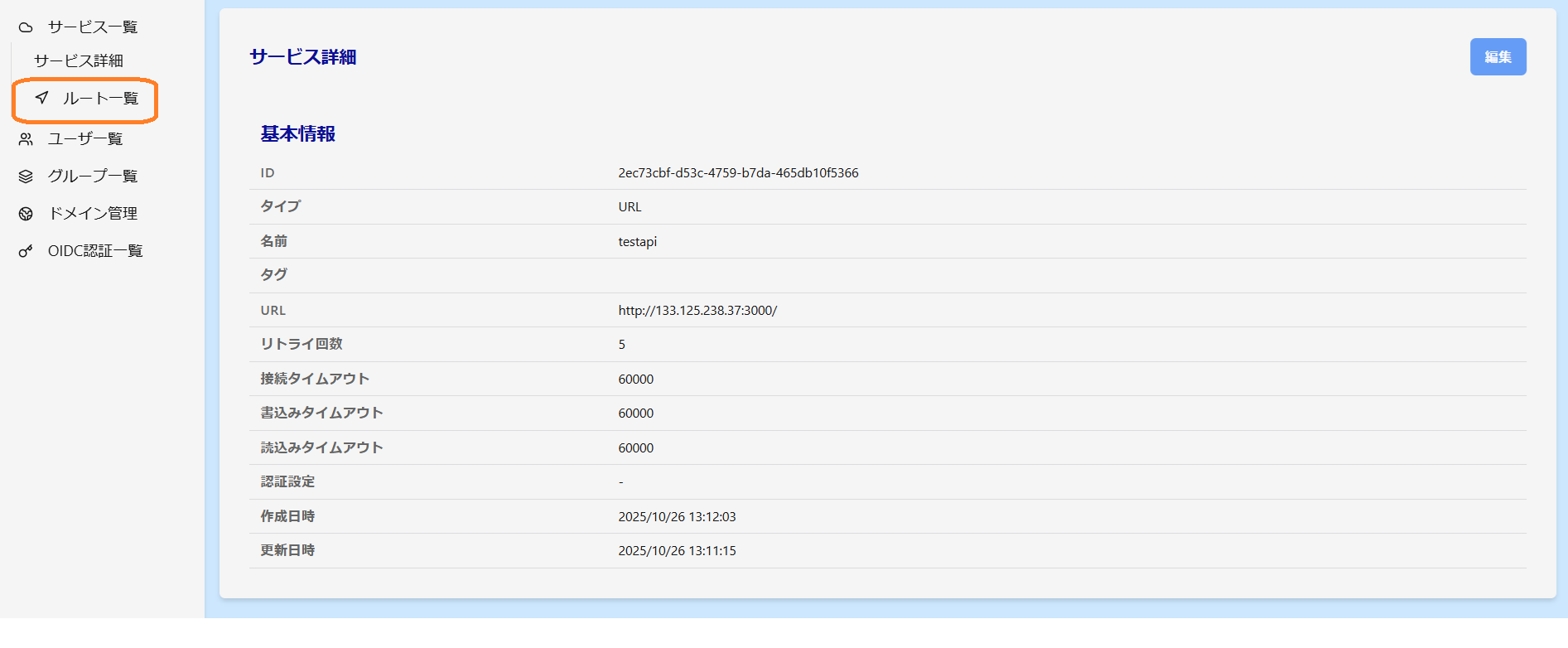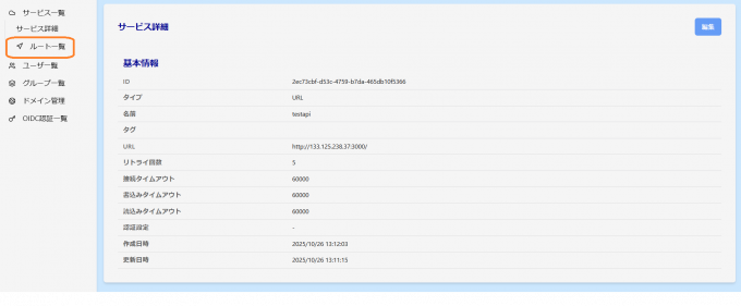 先ほど作成したサービスをクリックし左ペインから ルート一覧 をクリックします。