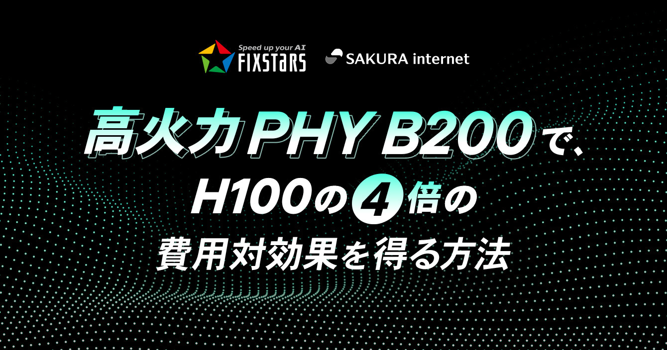 株式会社フィックスターズでパフォーマンスエンジニアリングラボ長を務めている吉藤です。フィックスターズでは、以前よりさくらインターネット様と高火力 PHYを使った共同研究開発とビジネス協業を推進しており、最近ではH200を使った検証やH100x8ノードの検証を実施しました。