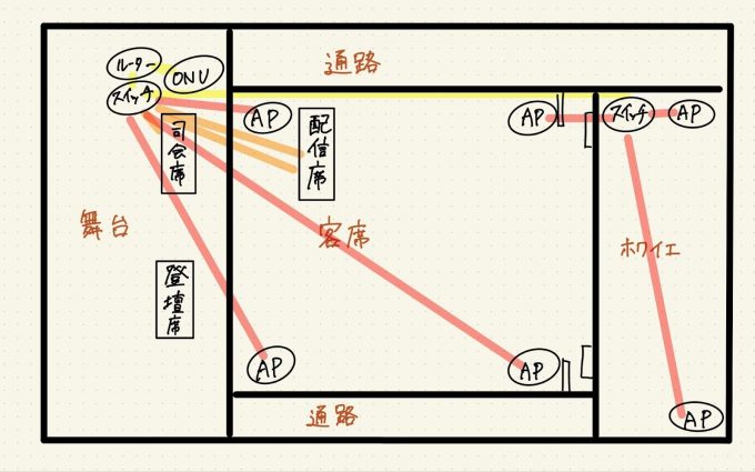 次に取り組んだのは配線図の作成です。決定したトポロジを実現するために会場の図面を見ながら具体的にどこにケーブルを通すかということを考えました。トポロジの決定の時点である程度の配線は考えていましたが、必要なケーブル長を正確に算出するため、また会場当日の配線作業の際に困らないようにということを意識してできるだけ詳細に配線図案を書き込みました。特に客席後方に置くAP に関してはそれを意識しました。