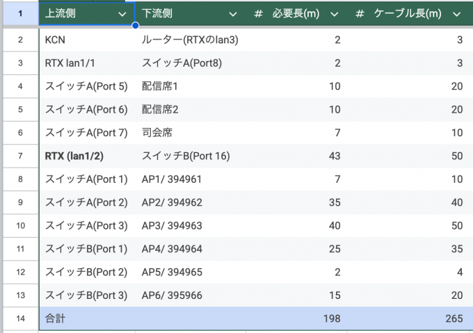 会場図面に書き込んだ配線図を元にまずはケーブルの必要長を算出しました。ここでいう必要長とは要件を満たすために最低限必要な長さのことです。そして、必要長を元に実際に作成するケーブル長を決定しました。敷設作業の際のちょっとした変更やトラブルに対応できるように、必要長のおよそ1.3倍をケーブル長として設定しました。また今回使用できるケーブルは300メートルだったのでその範囲に収まるかも確認した上でケーブル長を最終的に決定しました。
