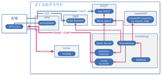 サーバーチームでは、来場者へのDNSとDHCPの提供に加え、ネットワーク全体の監視を担当しました。今回は、さくらインターネット様にご提供いただいたさくらのクラウド上にすべてのサービスを構築し運用しました。会場とはIPsecによる拠点間VPNで接続しました。