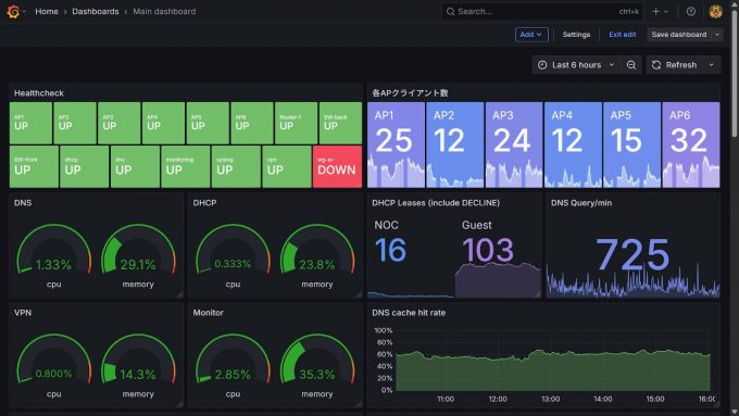 また、merakiAPIのexporterは各APのクライアント数などを確認できとても便利でしたが、何度かmeraki側の制限に引っかかってしまい、データが取得できない時間帯が発生しました。この部分については今後改善していきたいです。