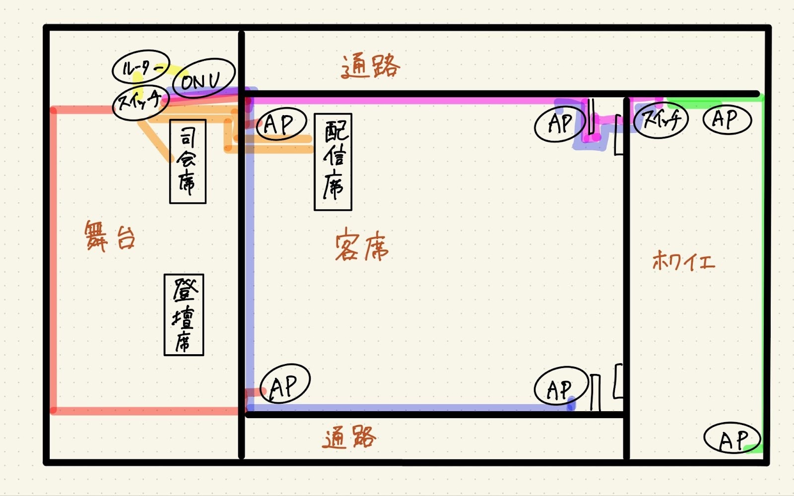 次に取り組んだのは配線図の作成です。決定したトポロジを実現するために会場の図面を見ながら具体的にどこにケーブルを通すかということを考えました。トポロジの決定の時点である程度の配線は考えていましたが、必要なケーブル長を正確に算出するため、また会場当日の配線作業の際に困らないようにということを意識してできるだけ詳細に配線図案を書き込みました。特に客席後方に置くAP に関してはそれを意識しました。