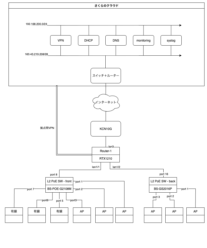 基本的なNATやフィルターの設定に加え、さくらのクラウドに配置したサーバーを使用するため、VPN・DHCP Relay・syslogサーバー・SNMPでの監視を行うための設定も入れる必要がありました。スイッチには管理用とゲスト用のSSIDを分けるためのタグVLANや、APに電力を供給するためのPoE+の設定を投入しました。これらの設定作業は前日までにチームで行った作業会で完了しており、本番当日は機器の配置と対外接続の設定を行いました。