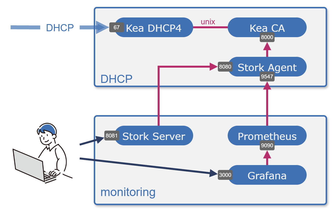 DHCP周辺の構成は以下の図のようになります。Kea DHCPをStorkで管理しつつ、Stork AgentからPrometheusでメトリクスを取得しGrafanaで可視化しています。Kea DHCPでは、ゲスト用とNOC用の2つのサブネットに対してアドレスを配布しています。