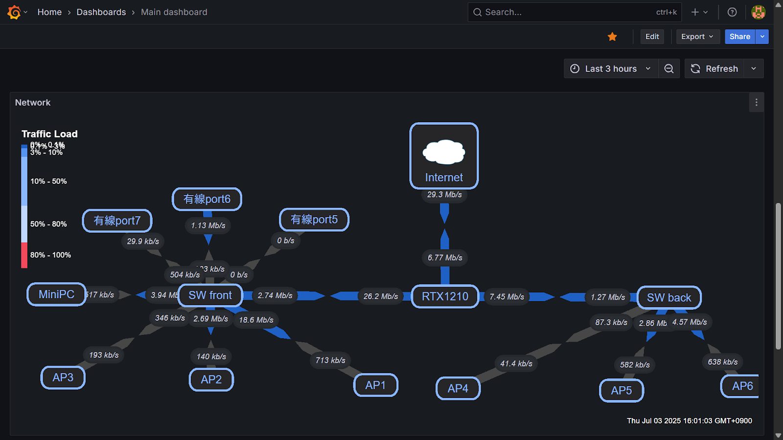本番では、講演会場の舞台袖にあるルーターへ接続しました。講演会場と展示ブース両方にAPを配置するために、2台のスイッチをそれぞれの会場に配置しました。ルーターとスイッチの監視はサーバーチームが準備したGrafanaで行いました。L2/L3での障害はWi-Fi提供だけでなく配信サービスの停止にも直結するため高い可用性が求められましたが、期間を通して安定した稼働を維持することができました。