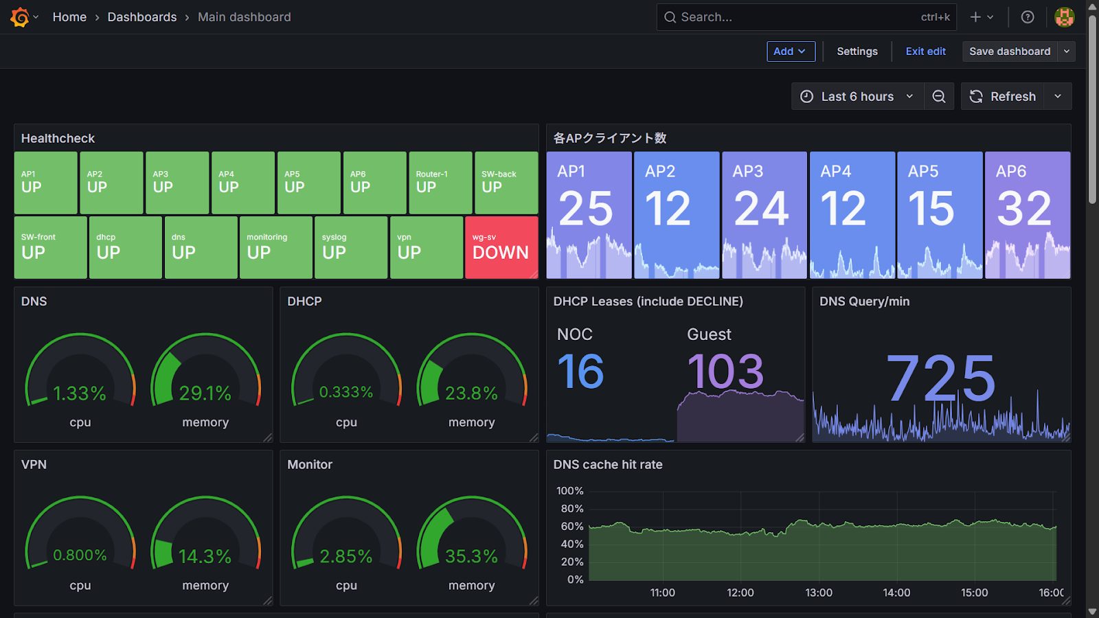 また、merakiAPIのexporterは各APのクライアント数などを確認できとても便利でしたが、何度かmeraki側の制限に引っかかってしまい、データが取得できない時間帯が発生しました。この部分については今後改善していきたいです。
