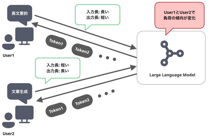 システム側の視点に立つと、ユーザーリクエストの内容に応じてシステムの処理の傾向が変わることになります。つまり、システムの負荷特性が各ユーザーの入力内容に大きく依存するため、システムの最適化が通常に比べて非常に難しいという問題として表出します。この問題は、ひいては推論システムへの適切な投資判断の困難性につながります。特にGPUのような高価なリソースを前提とするLLM推論基盤は多額の費用がかかるため無視できない問題です。