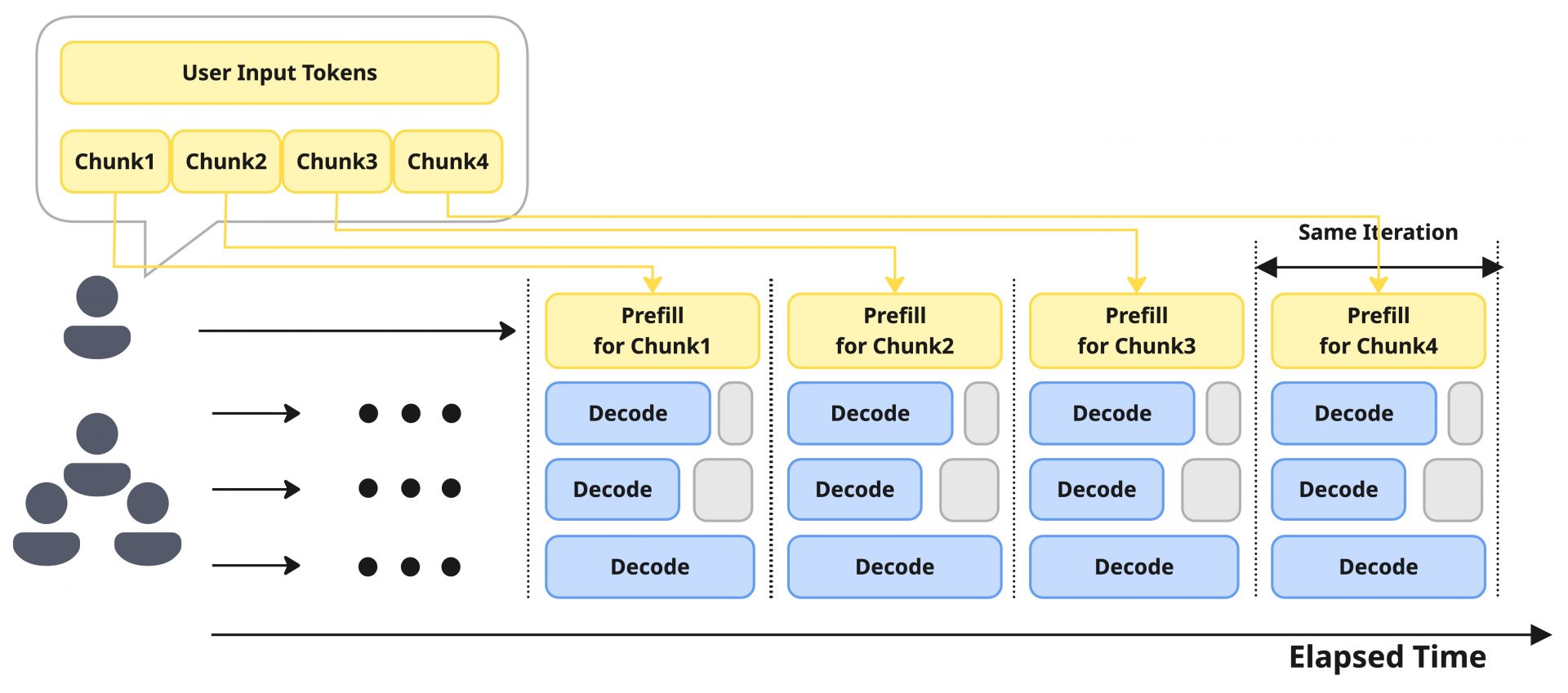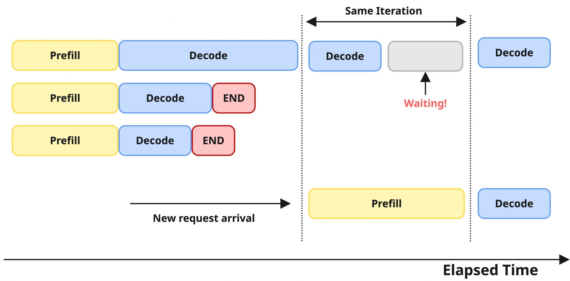 前述の通り、LLMの推論リクエストはPrefillとDecodeの2フェーズで明確に特性が異なり、バッチ化されたそれぞれのリクエストもPrefillの処理を行ったのち、Decodeの処理を行う流れになります。Continuous Batchingでは先ほど述べた通り、空いたバッチスロットにリクエストを詰めていくため、あるリクエストがDecode処理をするバッチの中に、新しいリクエストのPrefill処理が混じることがあります。この時、Decodeの1ステップに比べると、Prefillの1ステップは非常に時間がかかるため、同一バッチの中でDecode処理がPrefillの処理を待つという現象が発生します。