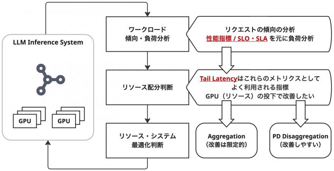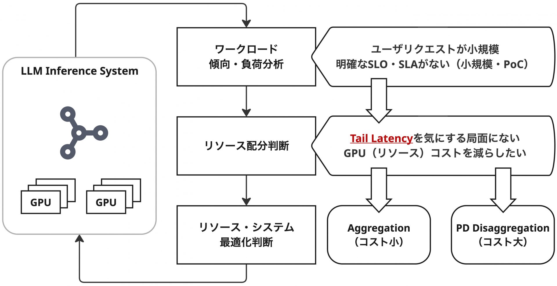この視点に立つと、Prefill処理とDecode処理が同一バッチに混ざる方式は、特にSLO・SLAの要件として設定することの多いTail Latencyの値が、システムへの投下コストに対して十分に改善しないということにつながる可能性があります。GPUのような非常に高価、かつリソース量に物理的な制限があるような環境において、この問題は無視できないと言えます。