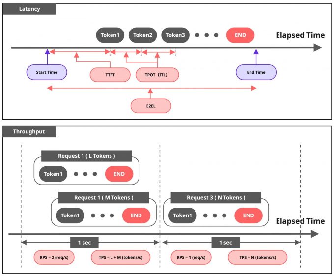 | Latency | E2EL | Total Latency(End to End Latency) ユーザーリクエストを送信してから、最後のトークンを受信するまでの時間 |
