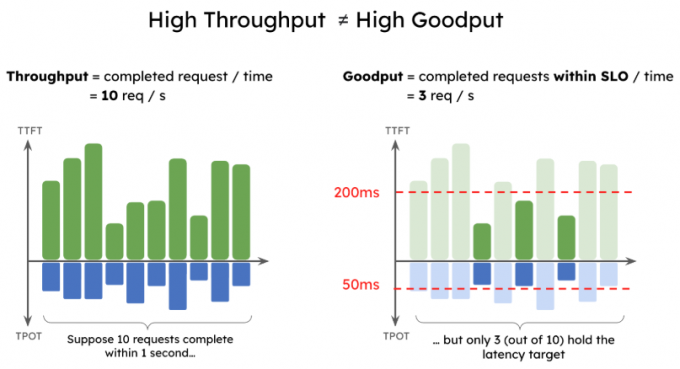 Throughputに関連するもう一つ重要な指標としてGoodputとよばれる、Throughputをさらに精緻化した指標が存在します。この指標もLLMの推論における指標としてよく目にするものになります。