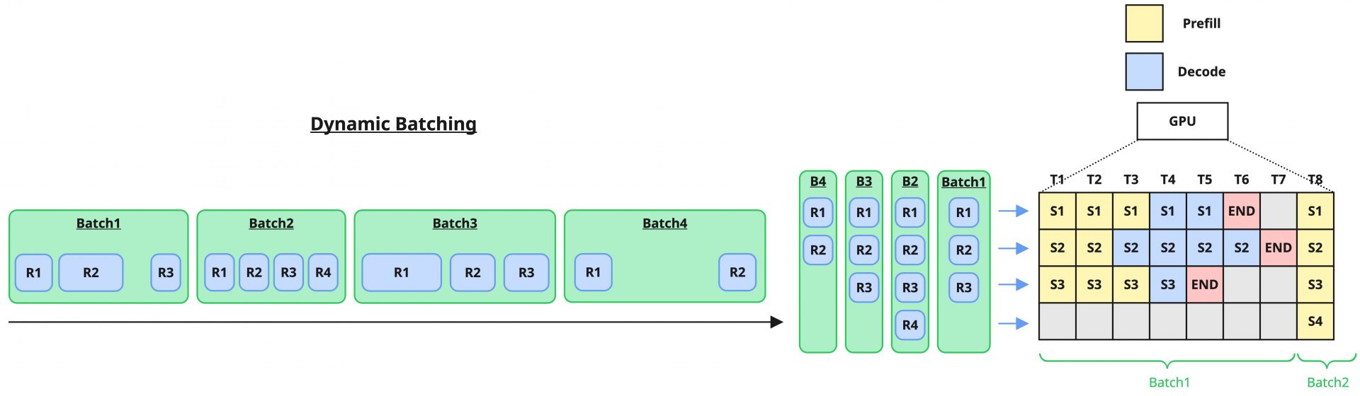 リクエストが多いケースでは即座にバッチサイズが埋まるため処理を開始し、リクエストが少ない場合も時間経過によってそれまで溜まっていたリクエストを処理するという、ThroughputとLatencyのバランスの取れた手法になっています。当然、バッチが完全に満たされない状況での処理の実行はLatencyを改善する一方でGPUの利用効率を最大化できないという欠点になります。また、Dynamic Batchingもバッチ単位で結果を返却することが基本のため、LLMの推論処理においては特定のバッチ要素に対して他のバッチ要素が影響を受けることは避けられません。