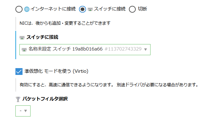 スイッチに接続するサーバを作成し起動します。このサーバはスイッチと同じゾーンである必要があります。サーバの作成方法の説明は省略しますが、作成する際にサーバを接続するネットワークとして「スイッチに接続」を選択し、先ほど作成したスイッチを指定します。