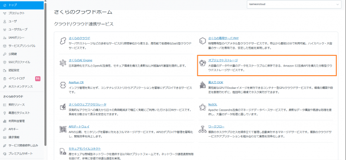 まずはさくらのクラウドのコントロールパネルのトップからオブジェクトストレージを選択します。