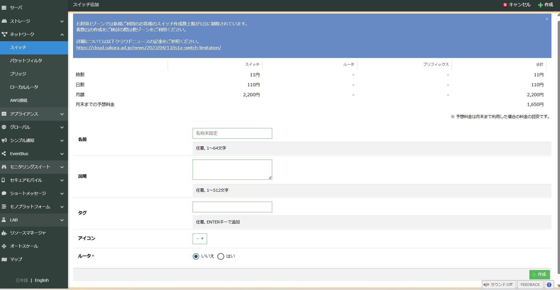 さくらのクラウドで提供されているスイッチには、L2で動作するスイッチとルータ付きL3で動作するスイッチ+ルータの2種類がありますが、SEGが対応しているのはスイッチになりますのでご注意ください。