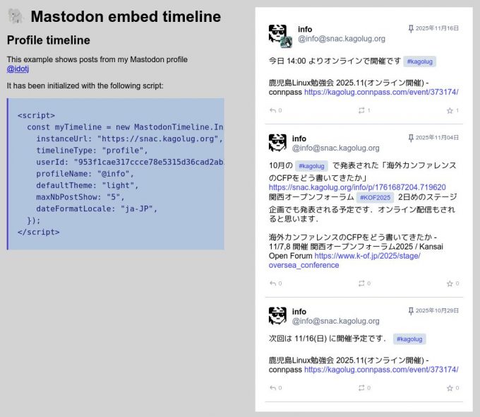 snacで投稿した内容をウェブページに埋め込むと便利そうなのではじめRSSを埋め込もうかと思ったのですが、「Mastodon embed timeline widget」を使うとMastodonアカウントをMastodon API経由でウェブページに埋め込みができるようなので試してみました。