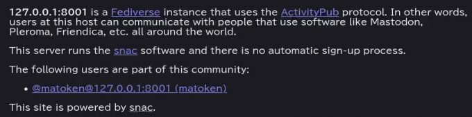 OSS系のActivityPubインスタンスでアカウントを取得するしかないかなと思っていたのですが、最近snacという軽量なActivityPubの実装を見つけました。