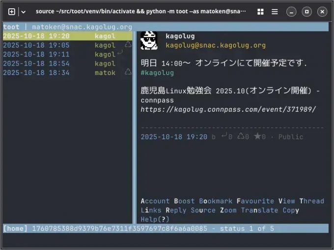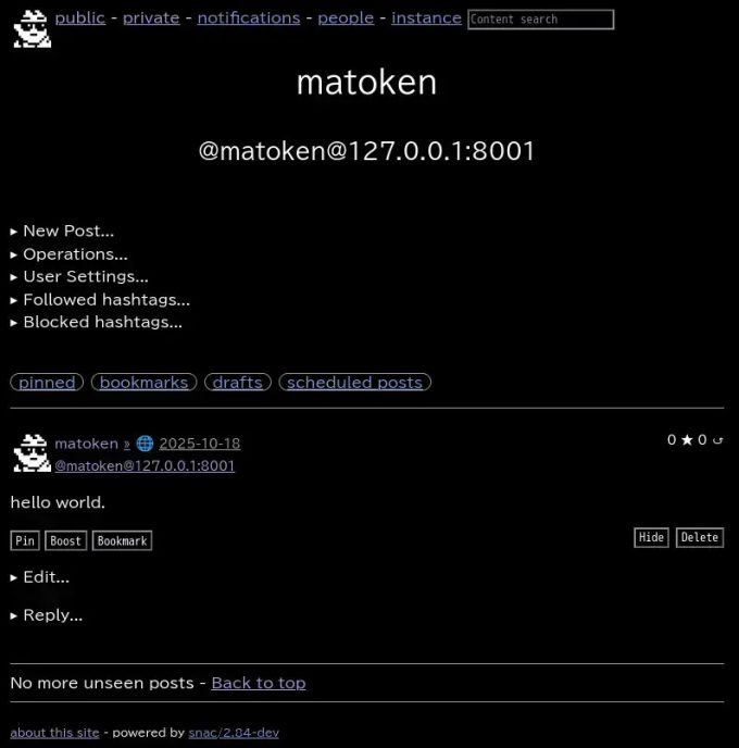 $ ./snac note ~/snac-data matoken "post from terminal"