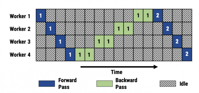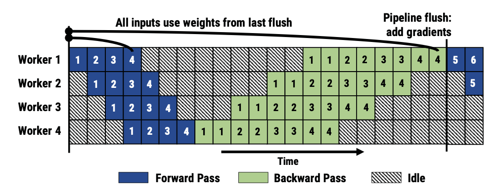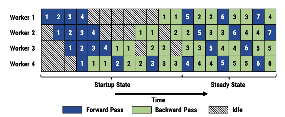 (以上3点の図は、Narayanan, Deepak, et al. "PipeDream: Generalized pipeline parallelism for DNN training.", OSDI 2019. より、Figure 2, Figure 3, Figure 4を転載したものです)