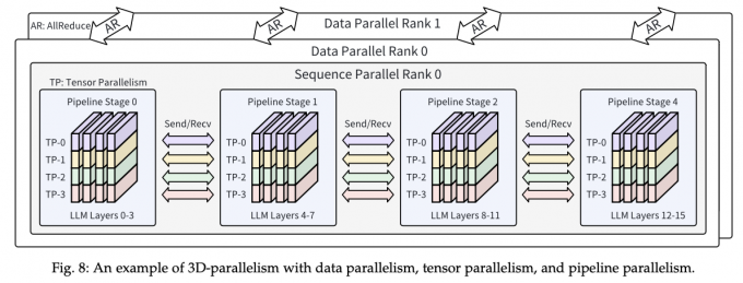 これらデータ並列、テンソル並列、パイプライン並列は互いに直交する概念であり、これら3つを組み合わせた並列化手法は3次元並列(3D Parallelism)(あるいはPTD並列)と呼ばれます。