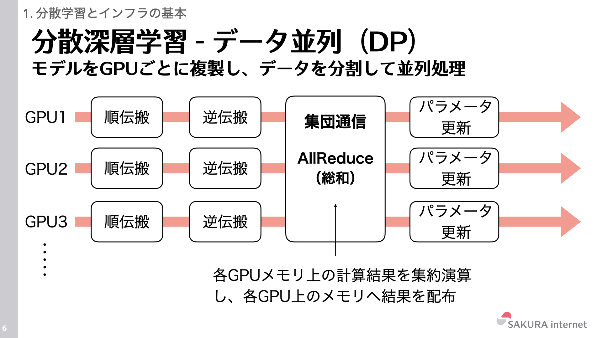 データ並列:モデルをGPUごとに複製し、データを分割して並列処理。各GPUメモリ上の計算結果をAllReduce(総和)で集約し、結果を各GPU上のメモリへ配布