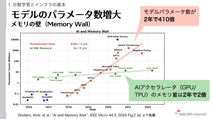 メモリの壁(Memory Wall):モデルパラメータ数が2年で410倍に増大する一方、AIアクセラレータのメモリ容量は2年で2倍程度の増加にとどまる (Gholami, Amir, et al., "Ai and Memory Wall.", IEEE Micro 44.3, 2024)