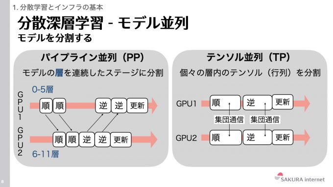 「メモリの壁」を解決するためには、これらのGPUメモリ上のデータを分散して、複数のGPUメモリ上で並列処理する必要があります。これを達成する方法がモデル並列です。モデル並列の代表例は次のパイプライン並列とテンソル並列です。いずれもTransformerの層を分割する手法ですが、分割する方向が異なります。