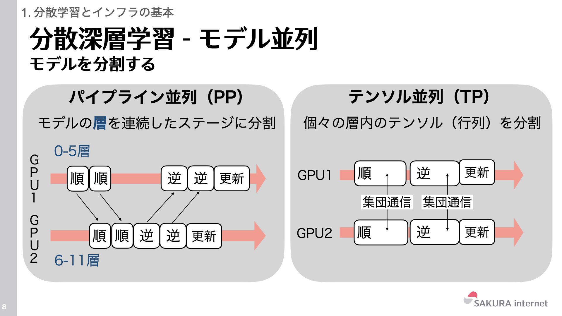 分散学習フレームワーク / ライブラリモデル並列・データ並列などをまとめて提供PyTorch Distributed(DDP)、Megatron-LM、NeMo、DeepSpeed、FairScale などテンソル並列・パイプライン並列・データ並列の組み合わせを実装し、GPUクラスタ全体にモデルを分割して配置する。
