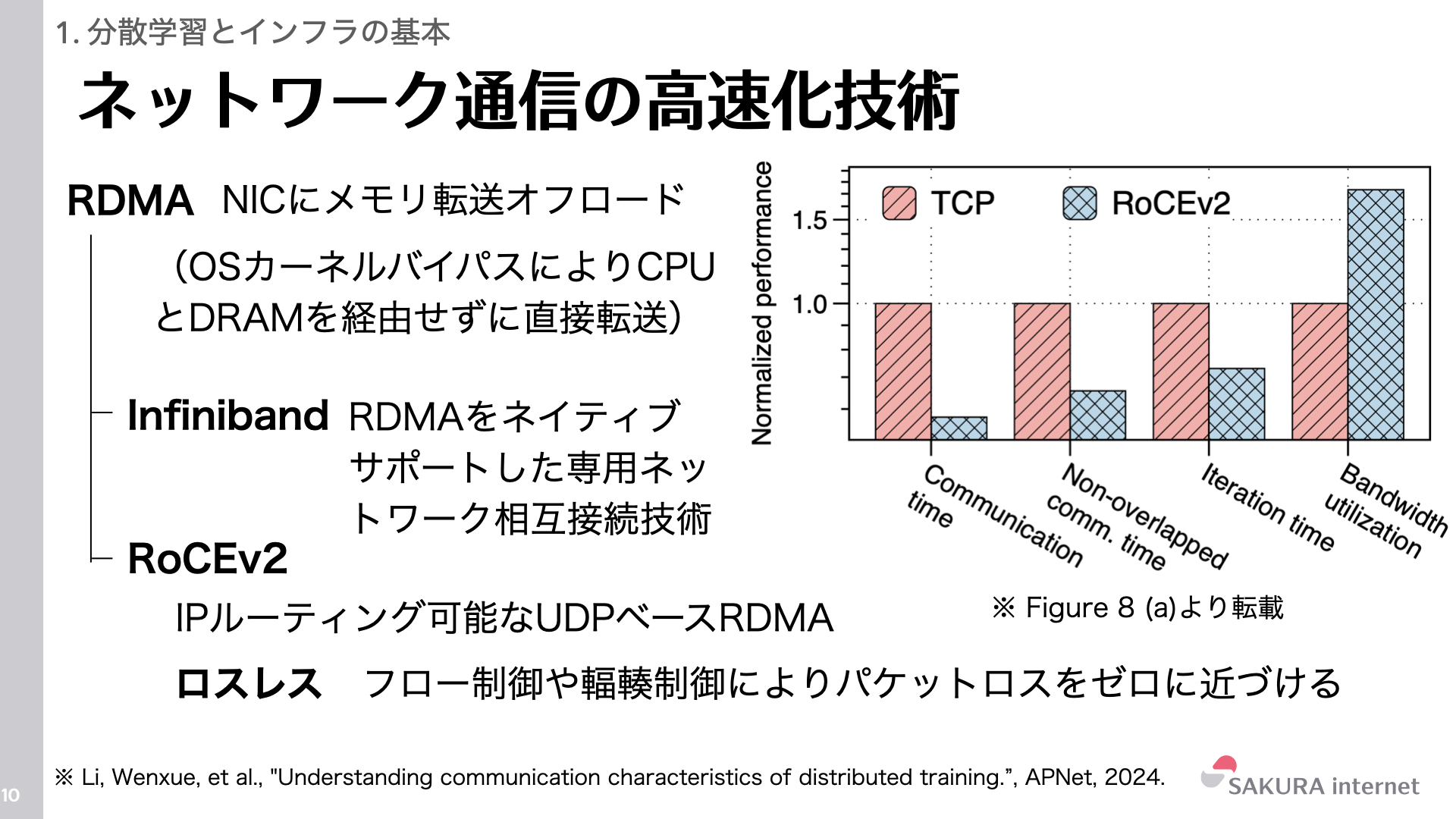 ネットワーク通信の高速化技術:RDMA(Remote Direct Memory Access)により、NICがOSカーネルをバイパスしてCPUとDRAMを経由せずに直接メモリ転送を行う。InfinibandはRDMAをネイティブサポートした専用ネットワーク相互接続技術。RoCEv2は、IPルーティング可能なUDPベースRDMAで、ロスレス(フロー制御や輻輳制御によりパケットロスをゼロに近づける)(Li, Wenxue, et al., "Understanding Communication Characteristics of Distributed Training.", APNet, 2024.を参照)