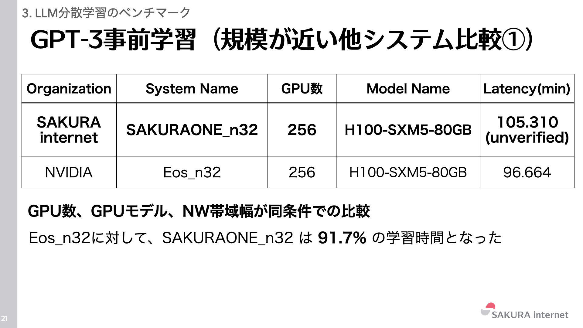 NVIDIA Eos(InfiniBand採用)の96.664分に対し、さくらONE(Ethernet採用)は105.310分でした。これはEosに対して約91.7%の速度であり、オープンなEthernet技術を用いながらも、トップレベルの専用機と概ね同等の性能を発揮していると言えます。