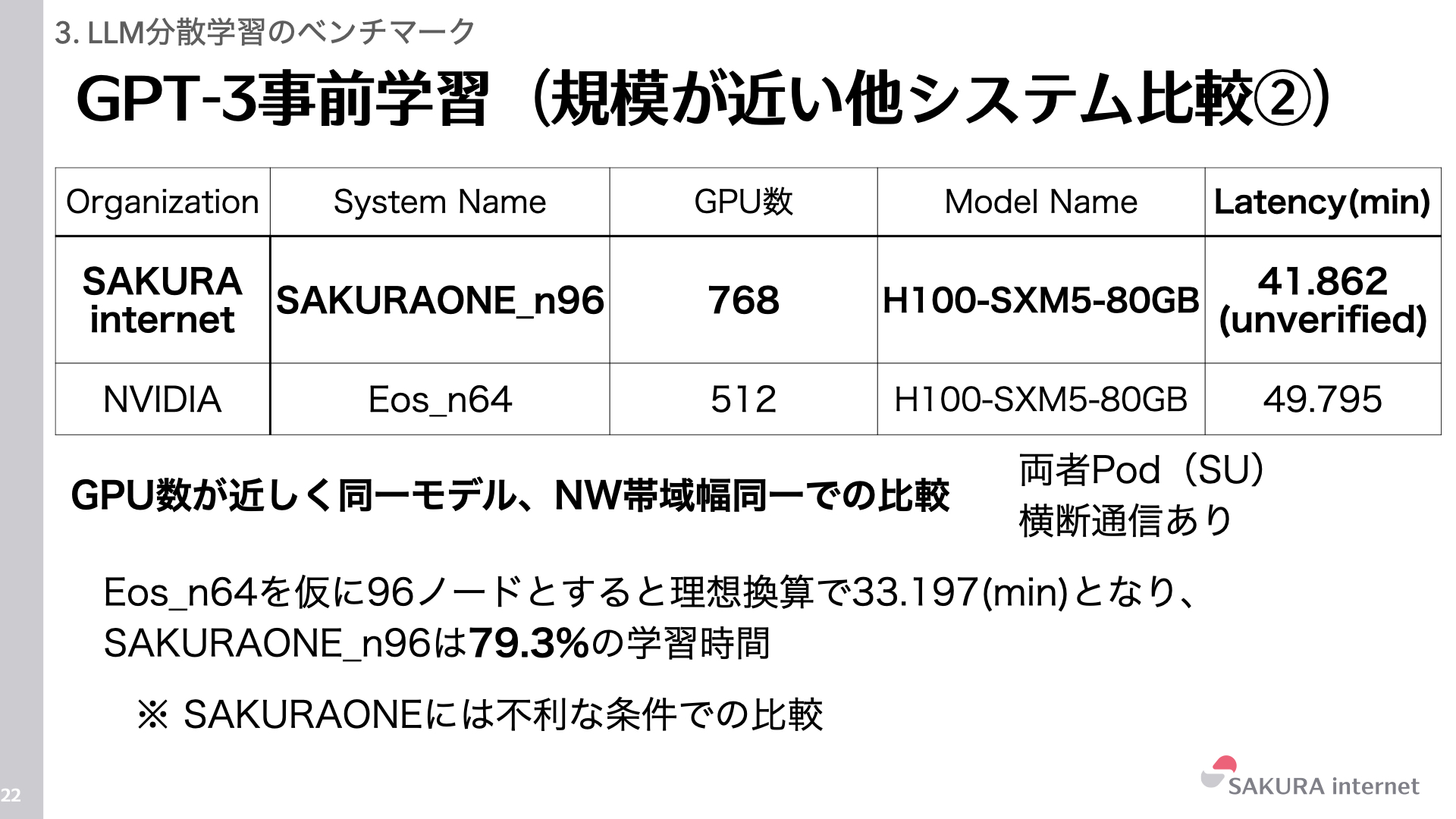 NVIDIA Eosの512 GPUの結果を、仮に96ノード(768 GPU)相当に理想的に換算すると約33.2分となります。これに対し、さくらONEの実測値は41.862分であり、理想値に対して約79.3%の性能(-20.7%の乖離)となりました。この要因としては、RoCEv2かInfiniBandであるかのネットワーク通信規格やネットワークスイッチデバイスの違いによる影響や、ソフトウェアスタックのチューニング不足などが考えられます。GPUの世代やネットワークトポロジなどは同一条件での比較です。