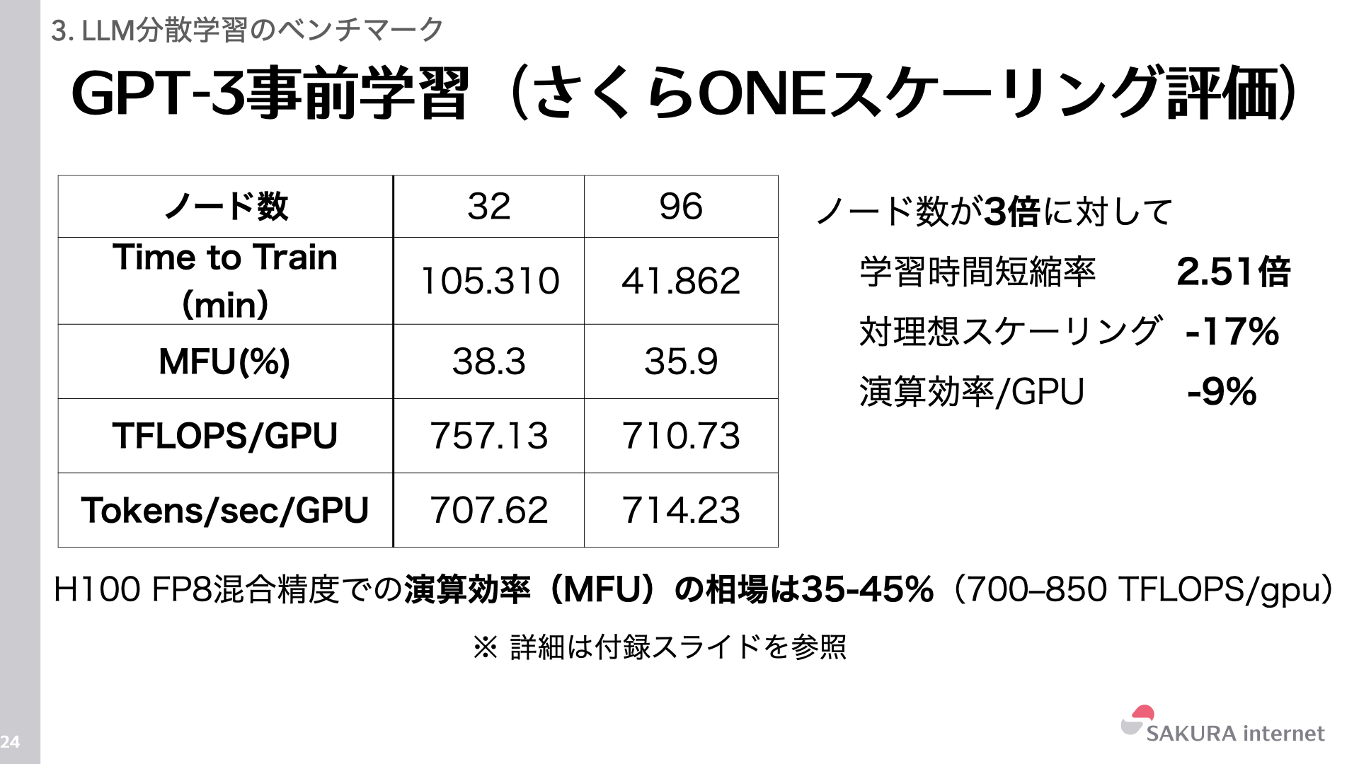 さくらONEのスケーリング性能:ノード数が3倍に対して学習時間短縮率は2.51倍、対理想スケーリング-17%。MFU(演算効率/GPU)は約36-38%で、H100 FP8混合精度での相場35-45%の範囲内
