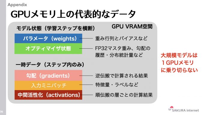 そもそもGPUメモリにはどのようなデータが格納されるのでしょうか?GPUメモリ(VRAM)の内訳は次の通りです。モデル状態(学習ステップを横断して保持)にはパラメータ(weights)とオプティマイザ状態(FP32マスタ重み、勾配の履歴・分布統計量など)が含まれます。一時データ(ステップ内のみ)には勾配(gradients)、入力ミニバッチ、中間活性化(activations)が含まれます。