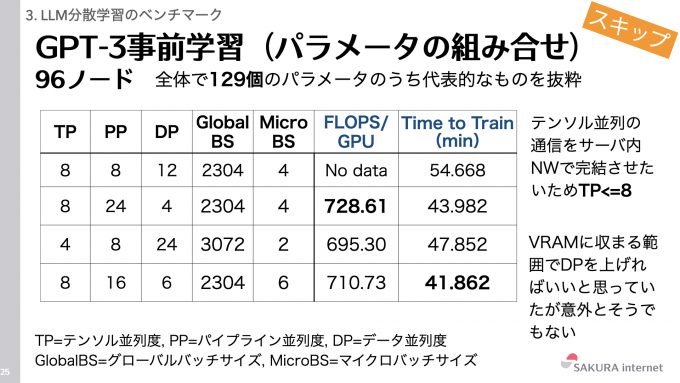 当初の基本戦略は、GPUメモリに収まる範囲でTP+PP数を調整し、DP数を最大化することでしたが、実際にはPP数を増やしたほうが性能が向上する結果となりました。しかしながら、PP数を増やすことにより、パイプラインバブルの影響もまた大きくなっている可能性があり、最適なパラメータを探索する余地がまだあると考えています。