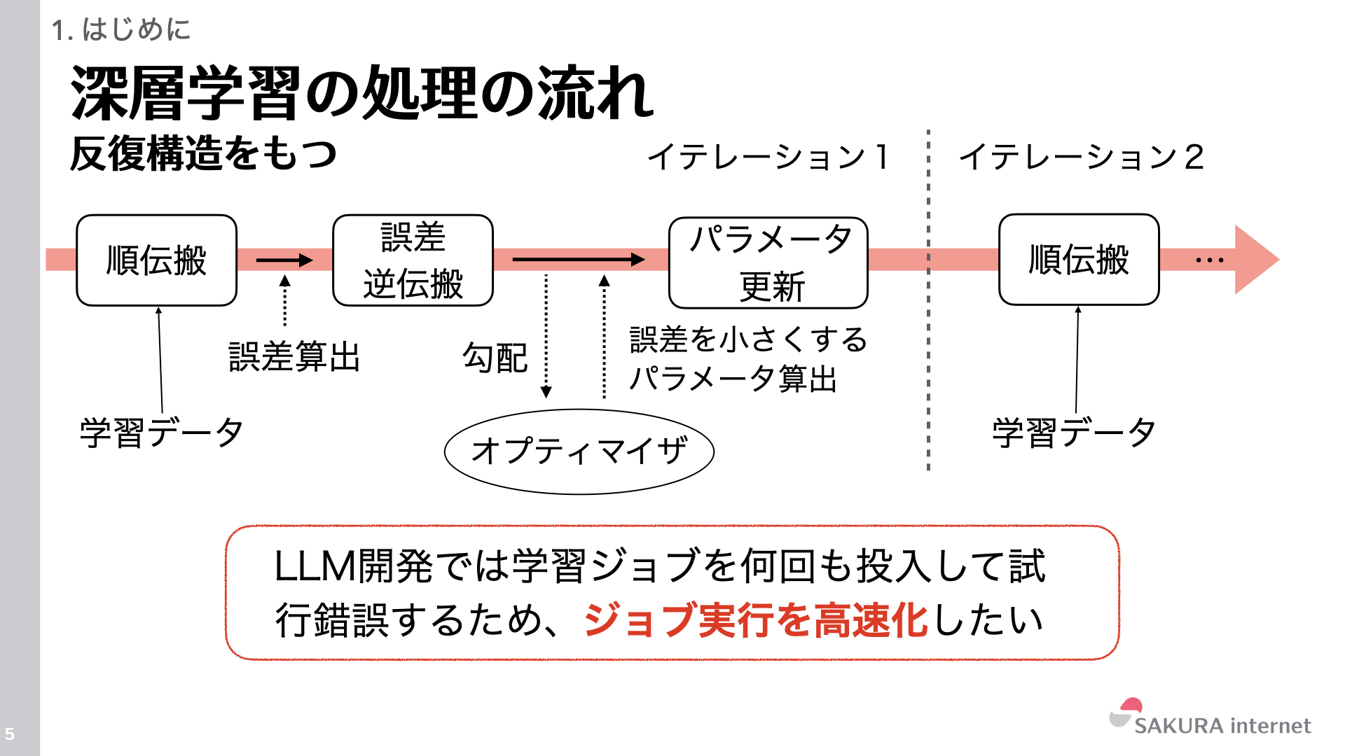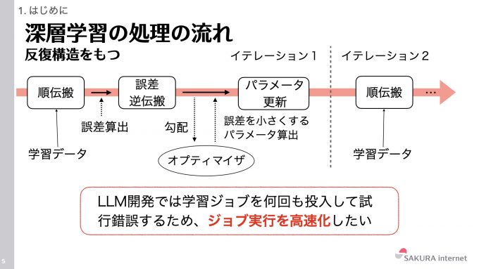 大規模言語モデル(LLM)の学習では、このサイクルをトークン数に依存して数万〜100万ステップ程度繰り返します。モデル開発では、このようなジョブを何度も試行錯誤するため、ジョブの実行速度が開発効率に直結します。ジョブの実行速度を高速化する手法は、様々な階層で様々な方法がこれまでに考案されています。