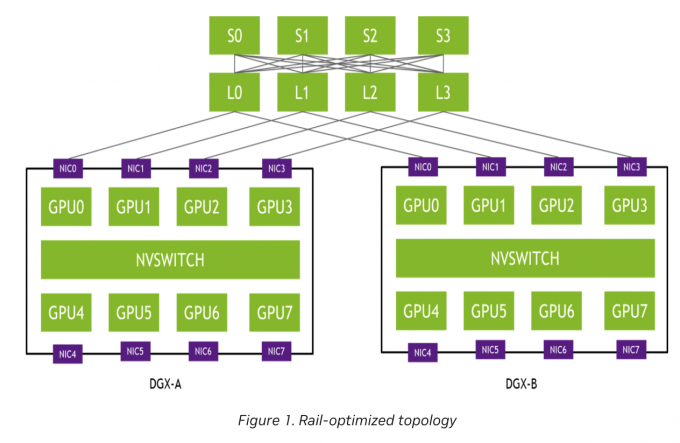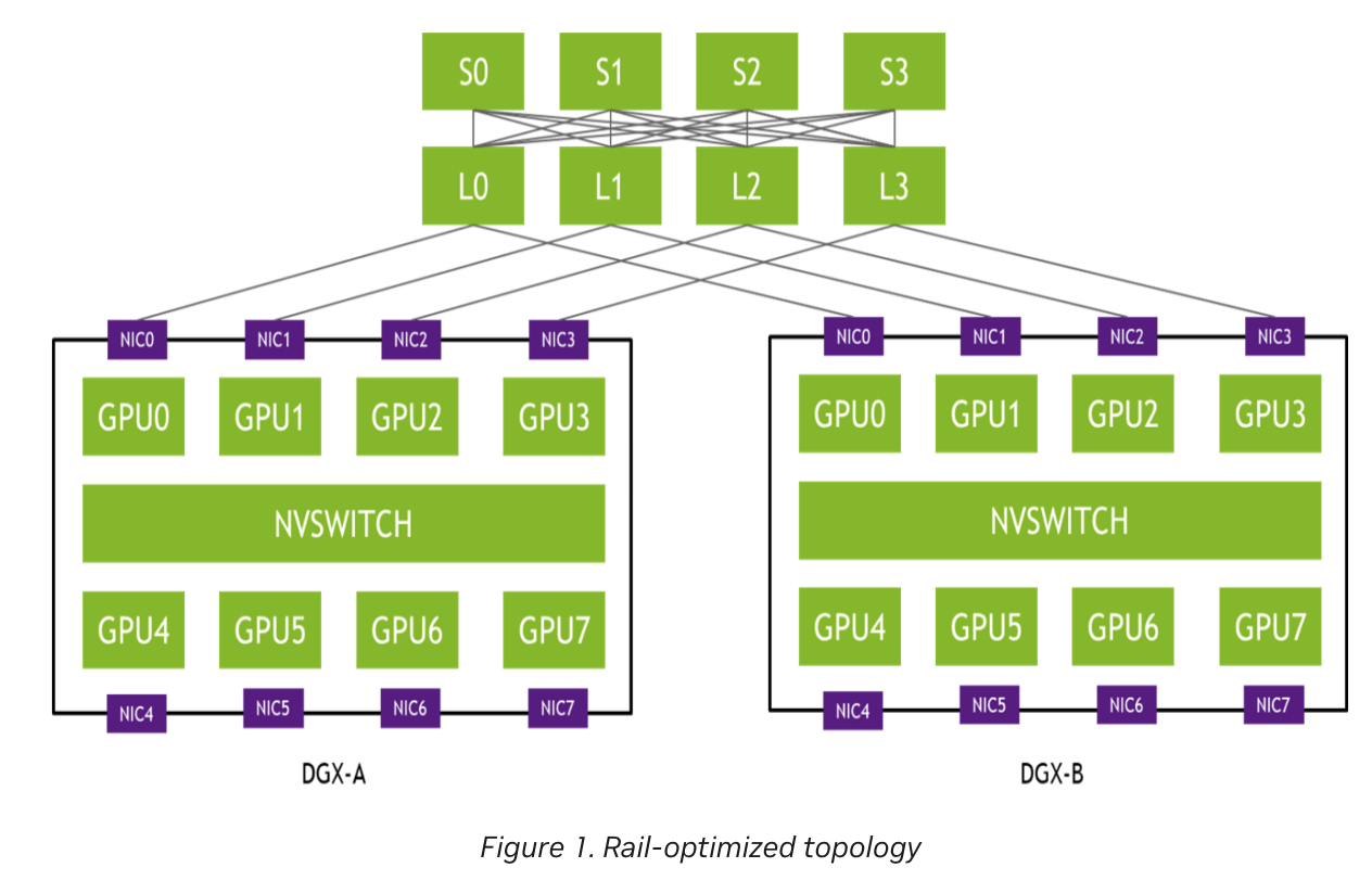 各ノードには上限8基のGPUが搭載され、NVLinkのような広帯域なチップ間インターコネクトで接続されます。これにより、ノード内のGPU間では数百GB/s〜TB/s級の高速な通信が可能となり、主にテンソル並列などの頻繁な通信を効率化します。