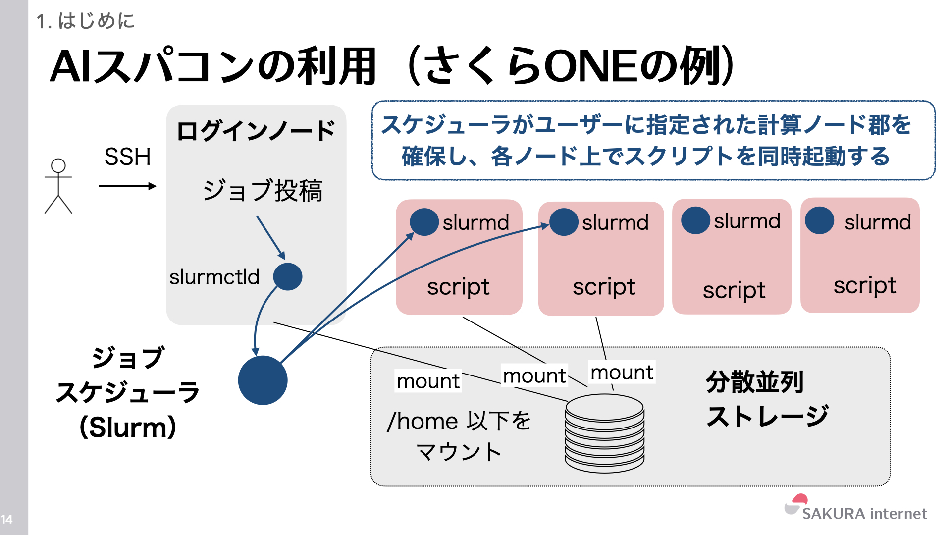 図はさくらONEの利用イメージです。ユーザーはログインノードにSSHで接続し、ジョブスケジューラ(Slurm)に対してジョブを投入します。Slurmは要求されたリソース(GPUノード)を確保し、各計算ノード上でジョブを実行します。全ノードは高速な分散ストレージを共有しており、データセットやコードへのアクセスが可能です。