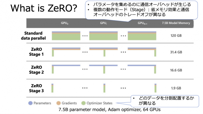 また、データ並列におけるメモリの冗長性を排除する技術としてZeRO (Zero Redundancy Optimizer)があります。通常のデータ並列では、全GPUがモデルパラメータやオプティマイザ状態の完全な複製を保持しますが、ZeROではこれらを各GPUに分割(シャーディング)して保持します。必要になるたびにGPU間通信で分割されたデータを集めます。これにより、各GPUのメモリ消費量を大幅に削減し、モデル並列を必ずしも用いずとも大規模なモデルの学習が可能になります。ZeROは、分割する対象に応じてStage 1(オプティマイザ状態のみ)、Stage 2(+勾配)、Stage 3(+パラメータ)の3段階があります。Stage番号が大きくなるにつれ、メモリ使用量は削減されますが、通信オーバーヘッドは増加します。