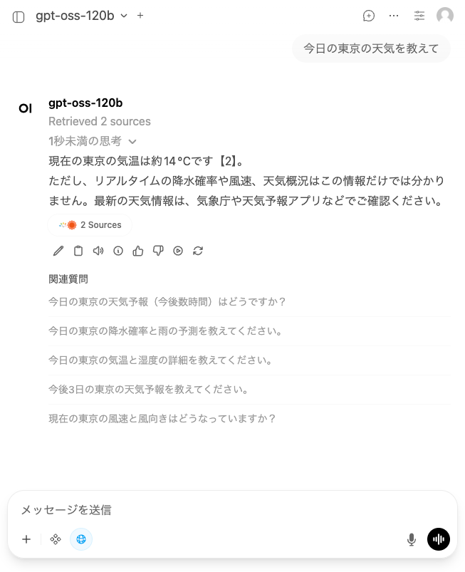 この問題を解決してくれるのが Web 検索機能です。この機能を有効にしてチャットを送信すると、その内容に基づいて Web 検索を実行し最新の情報をつかって回答を出力してくれます。